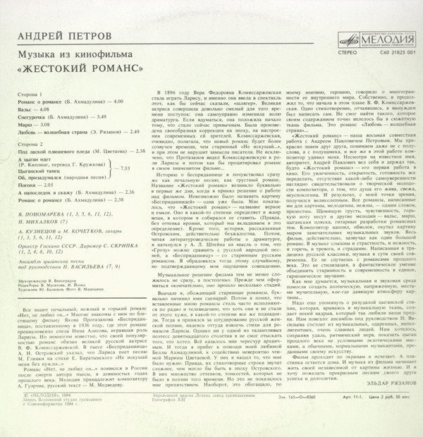 € 6.50 Media: Very Good (VG)Hoes: Very Good Plus (VG+)Андрей Петров = Андрей Петров – Музыка Из к/ф «Жестокий Романс» = Music To The Film «Cruel Romance» (LP, Album)