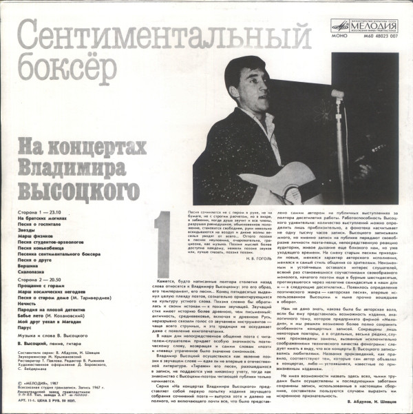 € 4.00 Media: Very Good (VG)Hoes: Very Good Plus (VG+)Владимир Высоцкий – Сентиментальный Боксёр (LP, Album, Mono, RP)