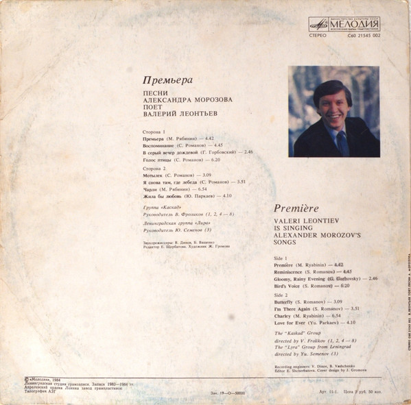 € 6.00 Media: Very Good Plus (VG+)Hoes: Very Good (VG)Валерий Леонтьев – Премьера. Песни Александра Морозова поет Валерий Леонтьев = Première. Valeri Leontiev Is Singing Alexander Morozov’s Songs (LP, Album, Whi)