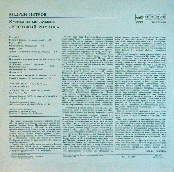 € 5.00 Media: Very Good (VG)Hoes: Very Good (VG)Андрей Петров – Музыка Из К/Ф «Жестокий Романс» (LP, Album, Whi)