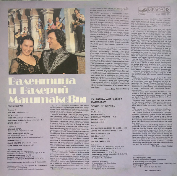 € 8.00 Media: Very Good (VG)Hoes: Very Good (VG)Валентина И Валерий Маштаковы – Песни Цыган (LP, Album)