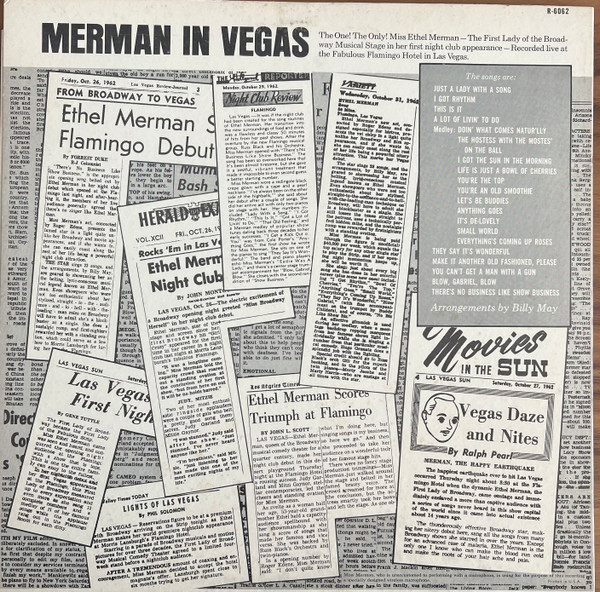 € 6.00 Media: Very Good (VG)Hoes: Good Plus (G+)Ethel Merman – Merman In Vegas (LP, Mono)