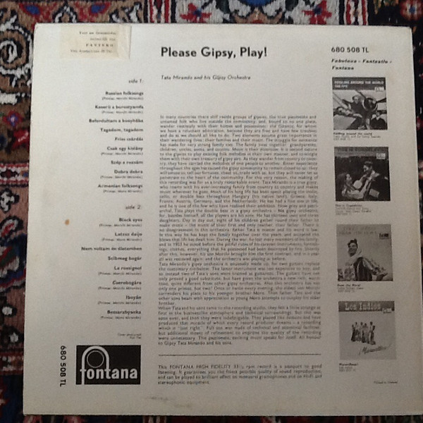 € 7.50 Media: Very Good Plus (VG+)Hoes: Very Good Plus (VG+)Tata Mirando And His Gipsy Orchestra – Please Gipsy, Play! (LP, Album, Mono)