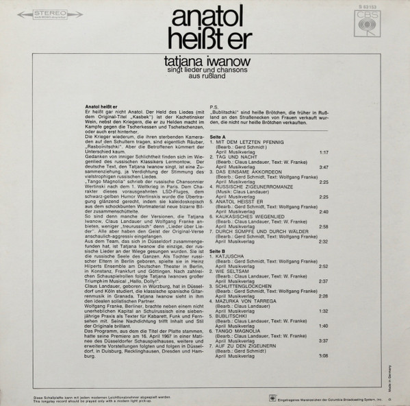 € 6.00 Media: Very Good (VG)Hoes: Very Good (VG)Tatjana Iwanow – Anatol Heißt Er – Tatjana Iwanow Singt Lieder und Chansons Aus Rußland (LP, Album)
