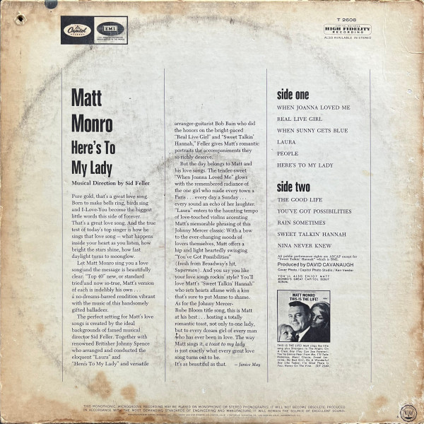 € 6.50 Media: Very Good (VG)Hoes: Very Good Plus (VG+)Matt Monro – Here’s To My Lady (LP, Album, Mono)