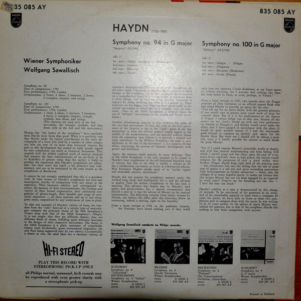 € 7.50 Media: Very Good (VG)Hoes: Very Good (VG)Joseph Haydn / Wiener Symphoniker / Wolfgang Sawallisch – Symphony No. 94 “Surprise” / Symphony No. 100 “Military” (LP)