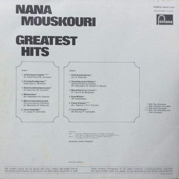 € 5.00 Media: Very Good (VG)Hoes: Very Good Plus (VG+)Nana Mouskouri – Greatest Hits (LP, Comp)