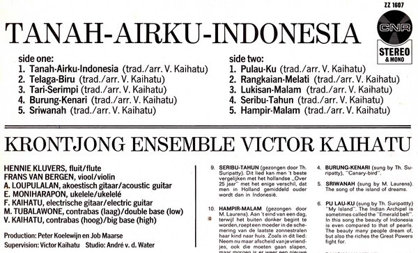 € 5.00 Media: Good Plus (G+)Hoes: Very Good (VG)Krontjong Ensemble Victor Kaihatu – Tanah-Airku-Indonesia (LP)