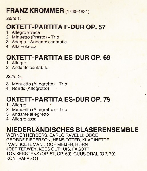 € 3.50 Media: Good (G)Hoes: Good Plus (G+)Krommer* – Niederländisches Bläserensemble* – Oktett-Partiten Für Bläser (LP)