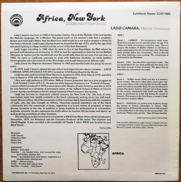 € 9.50 Media: Very Good Plus (VG+)Hoes: Very Good Plus (VG+)Ladji Camara – Africa, New York Drum Masterpieces (LP, Album, RP)