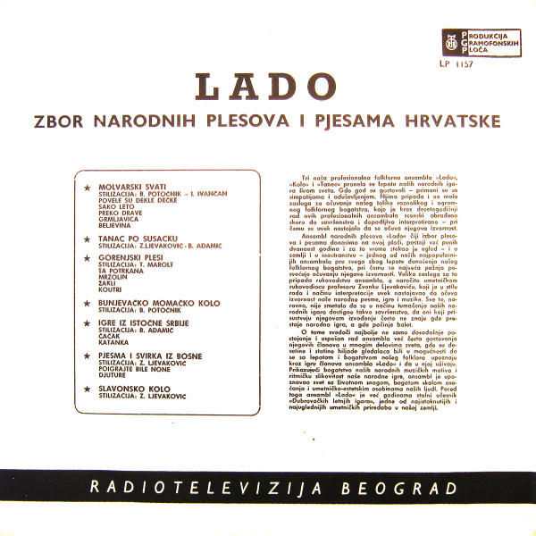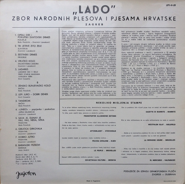 € 6.50 Media: Very Good (VG)Hoes: Very Good Plus (VG+)Lado (2) – Zbor Narodnih Plesova I Pjesama Hrvatske Zagreb (The Folk Dance And Folk Song Ensemble Of Croatia Zagreb Yugoslavia) (LP, Album)