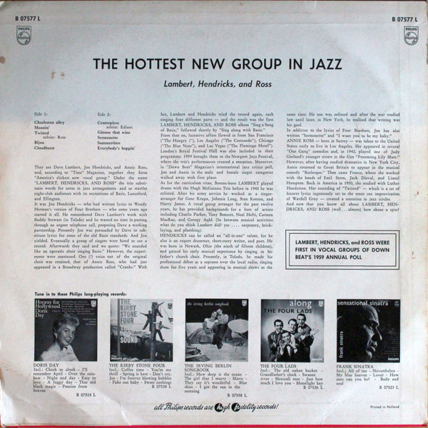 € 7.00 Media: Very Good (VG)Hoes: Good Plus (G+)Lambert, Hendricks & Ross – The Hottest New Group In Jazz (LP, Album, Mono)