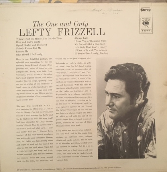 € 7.50 Media: Very Good Plus (VG+)Hoes: Very Good (VG)Lefty Frizzell – The One And Only Lefty Frizzell (LP, Album)