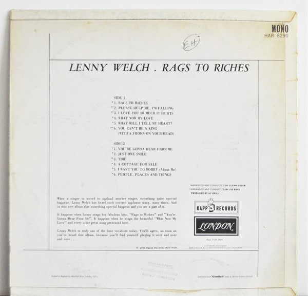 € 11.50 Media: Near Mint (NM or M-)Hoes: Very Good Plus (VG+)Lenny Welch – Rags To Riches (LP, Album, Mono)