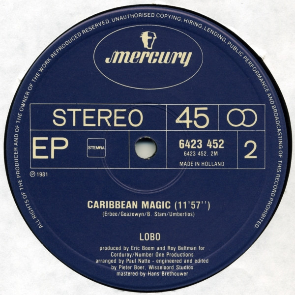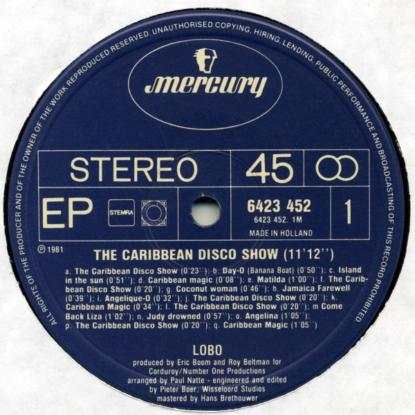 € 5.00 Media: Near Mint (NM or M-)Hoes: Very Good Plus (VG+)Lobo – Caribbean Disco Show (7″, EP)