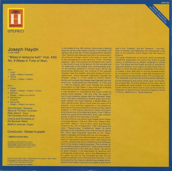 € 11.50 Media: Near Mint (NM or M-)Hoes: Very Good Plus (VG+)Joseph Haydn, April Cantelo • Jennifer Smith (3) • Helen Watts • Shirley Minty • Robert Tear • Ian Partridge • Benjamin Luxon • Christopher Keyte, The Choir Of St. John’s College, Cambridge*, Academy Of St. Martin-in-the-field*, George Guest (2) – Heiligmesse = Missa Sancti Bernardi De Offida = Mariazellermesse = Missa Cellensis (LP, Comp)