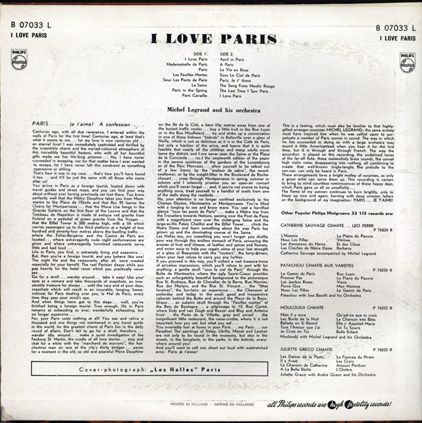 € 50.00 Media: Very Good Plus (VG+)Hoes: Very Good Plus (VG+)Michel Legrand Et Son Orchestre – I Love Paris (LP, Album)