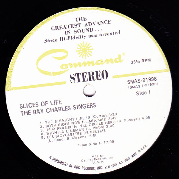 € 12.00 Media: Near Mint (NM or M-)Hoes: Very Good (VG)The Ray Charles Singers – Slices Of Life (LP, Album, Club)