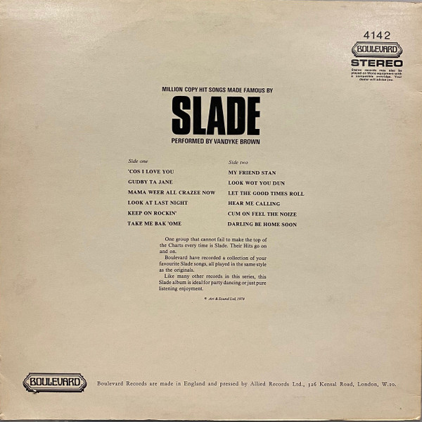 € 5.50 Media: Very Good Plus (VG+)Hoes: Very Good (VG)Vandyke Brown – Million Copy Hit Songs Made Famous By Slade (LP)
