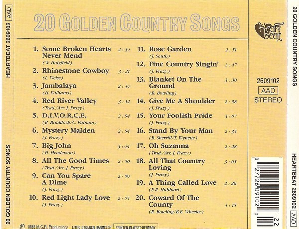 € 2.95 Media: Good (G)Hoes: Very Good (VG)Various – 20 Golden Country Songs (CD, Comp)